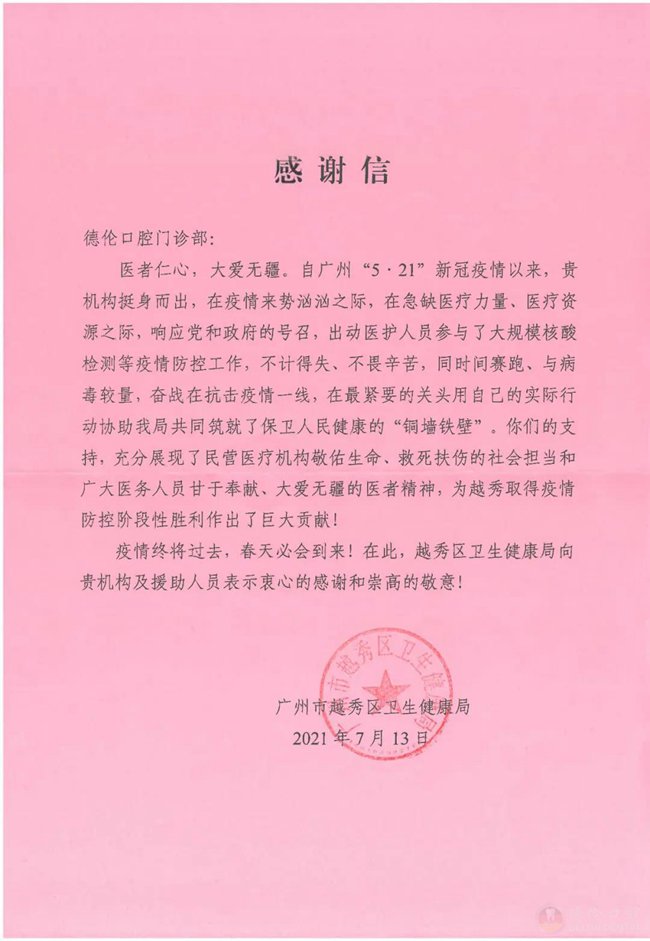 广州市越秀区卫生健康局致谢德伦口腔