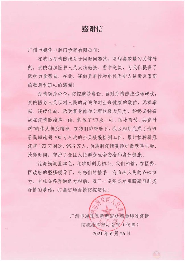 广州市海珠区新型冠状病毒肺炎疫情防控指挥部致谢德伦口腔