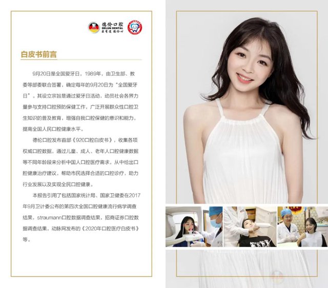 德伦口腔2021《口腔健康白皮书》收集了各项口腔数据,通过儿童、成人、老年人口腔健康数据等不同年龄段来分析中国人口腔医疗需求,从中给出口腔健康治疗建议,帮助市民选择合适的口腔诊疗,助力行业发展以及实现全民口腔健康。