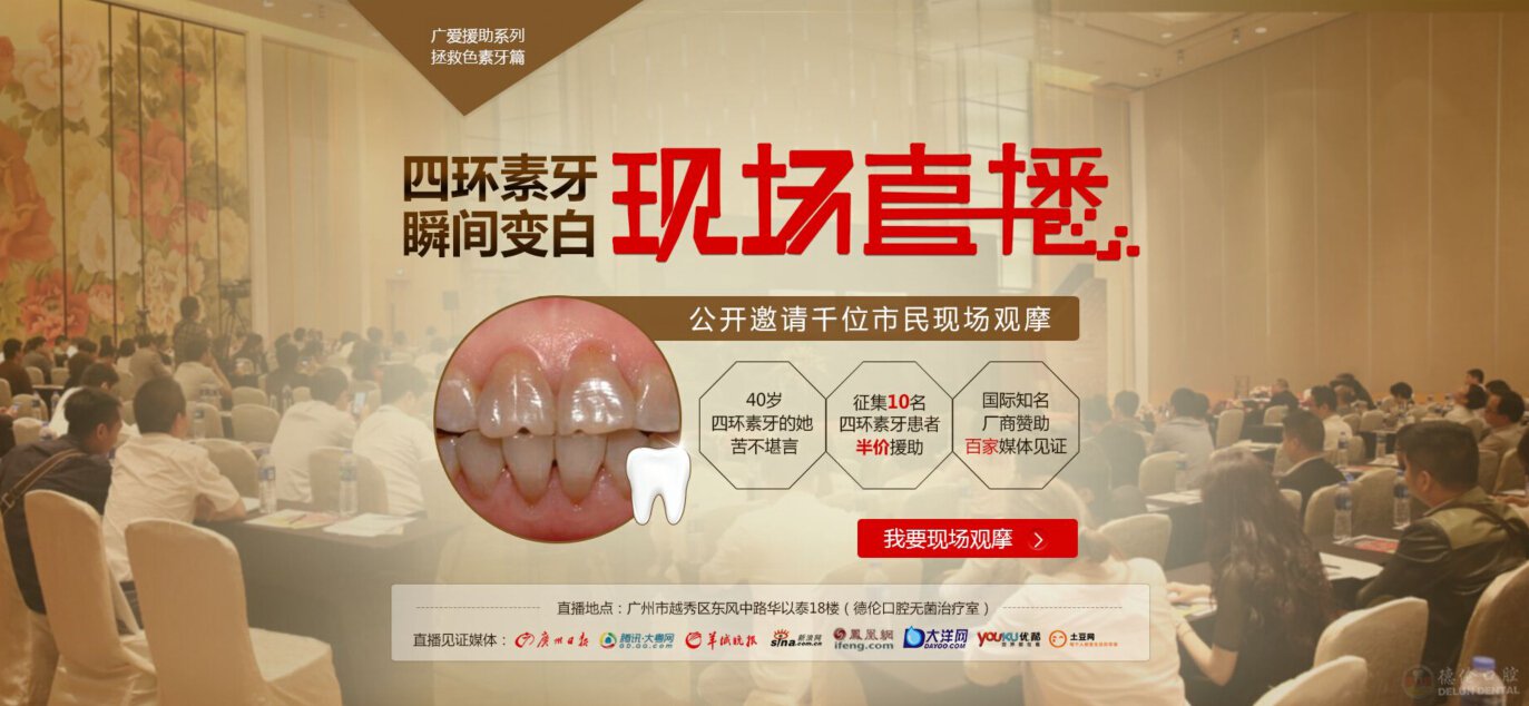10月24日《“拯救”色素牙公益行动· 四环素牙瞬间变白现场直播》暨DSD动态瓷玉美白修复新品发布会即将举行,届时将会现场直播四环素牙瞬间变白,现招募10名对牙齿颜色不满意的客户在当天享受半价美白牙齿优惠,并邀请1000名市民见证牙齿即刻变白瞬间,当天更有特别美牙政策援助被色素牙问题困扰的市民。